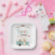 Whimsical paper plate design features "Happy Camper" text, Boho style arrow, mountain silhouette and retro style travel trailer