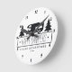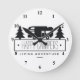 Cute Happy Campers wall clock for RVing campers- Rustic black and white camping design features a classic vintage travel trailer silhouette surrounded by pine trees. Reads HAPPY CAMPERS below in whimsical letters. Option to customise text. Black clock face numbers. Unique retirement gift for retiree ready to go see the world in their RV. Or nice gift for any RVers or camping addicts. Option to add a background colour as well! Unique camping home decor that would be perfect for an RV, log cabin, or fifth wheel camper. Great RV business office clock or for an RV salesperson. Just add business or name at top or bottom and slogan, address, or phone number.