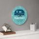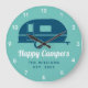 A cheerful wall clock, perfect for your camper or RV. Shown with a teal background and navy colored camper design with the phrase "Happy Campers". Customize your family name to make it one of a kind. Background color can also be changed to match your decor and preferences.