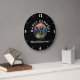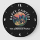 This clock with a black background design features a tent and pine trees. Around the graphic in white text is "Happy Campers" and below that you can customise the clock with your family name. A great edition for your camping outdoors adventure.