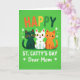 This card shows three cartoon cats lined up shoulder to shoulder on a soft green gradient background that feels like early spring. A dark green cat stands on the left, a white cat with lime-green spots leans in at the center as if cozying up to the others, and an orange cat on the right tilts its smile toward the group, giving the scene a friendly, affectionate closeness 💚. Across the top, the word “HAPPY” sits in large letters that shift from orange to yellow to deep green. The cats’ wide eyes and small smiles look outward, like they’re sharing a sweet inside joke with the viewer. Below them, “ST. CATTY’S DAY * Dear Mom *” appears in white text centered near the bottom edge, with the star separators adding a little sparkle. Tiny white shamrocks float around the cats like confetti, reinforcing the St. Patrick’s Day theme ☘️. The overall layout is simple and graphic, with flat color areas and crisp outlines against the green backdrop. White shamrock shapes are scattered across the background, some near the top corners and others drifting beside the cats.