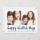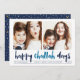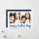 Whimsical Hanukkah photo card features two of your favorite family photos in a square format aligned side by side. "Happy Challah Days" appears beneath in blue hand lettered style brush typography. Personalize with your family name or names, custom greeting, and the year along the bottom. Cards reverse to a pattern of white snow and yellow stars on a navy blue background. A funny and modern Hanukkah card designed to add lighthearted joy to your holiday mailings.