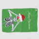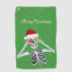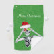 This golf towel has a happy skeleton in a red Santa hat holding red and green snowflake ornaments up to his eyes on a green background with faux gold sparkles. Customise your text with the template.