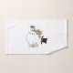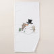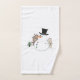 Illustration of a cartoon style Christmas snowman in a snow scene with snow covered houses and a tree in the background.
