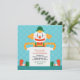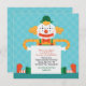 A cute children's invitation featuring a happy clown holding up a sign with your party's information.