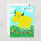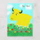 Happy yellow cow in a meadow cartoon. The cow has a happy smiling face. He is in a green grass meadow with yellow and red flowers under a turquoise blue sky with white fluffy cows. Message reads 'Hey Moo'. Easily personalise this card by editing the template text or remove the test altogether. Thanks for viewing my designs!