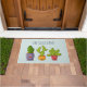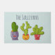A personalised doormat with a whimsical illustration featuring 3 happy little cacti sitting in their own flower pots. They each have their own unique expressions smiling and looking happy.
