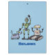Happy cute robots trio cartoon on blue background. Robots are cool!