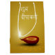 Shubh Diwali illustration: red diya (a cup-shaped indian oil lamp) with an indian ornamental mandala and the greeting written in Sanskrit.