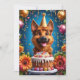 A cheerful dog wearing a party hat enjoys a birthday celebration with a vibrant cake and festive decorations, creating a joyful, celebratory atmosphere.