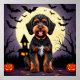 Adorable black and brown dog sitting amid a Halloween-themed background featuring a full moon, flying bats, and glowing jack-o'-lanterns, creating a festive and spooky autumn atmosphere.
