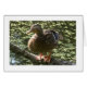 A happy looking Mallard hen sits on a branch taken at Roath Park Lake, Cardiff.