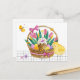 A cute & festive Easter greeting card featuring an Easter basket filled with tulips, painted eggs and an adorable chick!