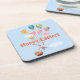 Beverage coasters with my artwork of a cute little rabbit holding onto a bunch of striped balloons floating up into the sky while carrying a basketful of Easter eggs. Customisable text says "Happy Easter!"