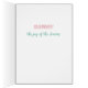 This a cute Easter Season greeting card that features a happy smiling yellow duck holding a bunch of pastel coloured balloons. The duck stands in front of a matching pastel picket fence, and a little white bunny rabbit holds a small bouquet of flowers. The colourful text says Happy Easter. The images and text are placed on a light pastel green background. The inside of the card has two additional text fields for you to customise.