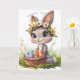 Adorable cartoon style little girl bunny has a cute smile and big happy eyes. She has flowers in her hair. She is sitting in the grass with a basket filled with colourful Easter eggs.