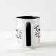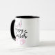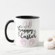 This two-toned mug features pink bunny ears and bunny feet with the words "Happy Easter" in a black decorative script.
