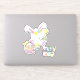 This a cute contour sticker for the Easter Season! It features a little white bunny wearing a spring flower head band. An easter basket of pattern Easter eggs sits in front of him, as well as a yellow chick popping out of an egg shell. Behind the bunny rabbit is a yellow tulip. The colourful text says Happy Easter. Wonderful for Easter decorations, and fun for all ages! *Thanks to Prettygrafik Design for some of the images used in this design.