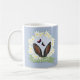 This happy Easter mug features a pretty floral daisies happy easter wreath with grey bunny ears and butterflies on a blue background.