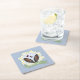 This happy Easter coaster features a pretty floral daisies happy easter wreath with grey bunny ears and butterflies on a blue background.