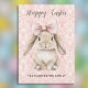 This charming card, which is available as a download, features a charming young bunny with a huge pink satin bow. It says "Happy Easter" at the top, with a placeholder for your family's or organization's name below. You can easily edit either text field to personalize this card. The back is pink, with plenty of room to write a message if you want, or add your own photo on the back or leave blank. It's up to you!