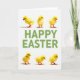 This card features six newly hatched little birds with sunny yellow fluff on a bright white background, arranged as three at the top and three at the bottom. Each tiny bird has an orange beak and small orange feet, and their slightly different poses create a friendly, close-knit feel, like companions leaning toward one another. Soft, diffused lighting makes their down look airy and gentle, with faint shadows that keep the scene grounded. Across the center, large green uppercase text reads “HAPPY EASTER,” forming a strong horizontal band that separates the two rows. The letters sit right in the middle and stretch across the card, balancing the birds above and below. The crisp white space around everything keeps the yellow and green colors looking fresh, and a small touch like 🌷 or 🐣 would fit right in with the spring look. The top row faces inward toward the center line, while the bottom row mirrors it, framing the green words between them.