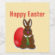 Happy easter chocolate bunny with green tie and red egg on pale orange background.