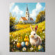 Happy Easter with this cute animals like easter bunny or baby chick. Join the easter egg hunt in spring with vibrant colours and joy, candy and a floral vintage fantasy. Cute rabbit with flowers and a church in the background.
