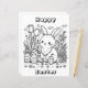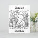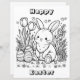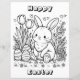 Easter themed children's colouring page. Cute Easter bunny with her Easter eggs surrounded by tulips.