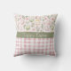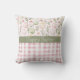 Spring throw pillow featuring an Easter-themed design. The top section of the pillow displays a pastel-coloured pattern of decorated Easter eggs, delicate flowers, and leafy branches on a light background. The middle section contains a muted green band with the text "Happy Easter" written in elegant white font. The text can be customised to your preference. The bottom section showcases a pink and white gingham plaid pattern, adding a cosy, country-style charm. The combination of soft pastel tones and festive motifs creates a warm and cheerful aesthetic perfect for Easter décor.