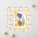 Original illustration in oil pastel of a large colourful decorated Easter egg with a little chicken, sunshine and grape hyacinth. With customisable text saying Happy Easter and Easter floral pattern frame. On the back side is blank space for text with Easter pattern frame and small daffodil Easter illustration in the corner.