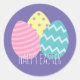 This design features three colourful Easter eggs on purple background with custom text. Background colour can be changed to whatever you'd like.