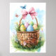 Happy Easter with this festive holiday greetings in a soft cream pastel watercolor look with vibrant easter eggs and floral elements. Time for the easter egg hunt with a basket.