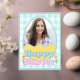 This custom greeting card features a cute and colourful Easter theme. An egg frame is placed in the centre with a sample photo that you can personalise to include your own custom photo or image. A "Happy Easter" greeting is printed below in a whimsical blue and pink font. Little Spring flowers are placed on either side of the greeting. The background is a pastel teal plaid pattern.