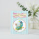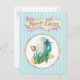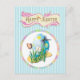 This whimsical easter holiday design has a classic pale blue and white pinstriped background.