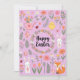 Playful pastel Easter card featuring a floral wreath, cute bunnies, a chick, a fox, decorated eggs and spring flowers. Charming, whimsical design