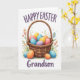 This design shows a warm brown woven basket centered on a white background, its textured weave drawn with cozy detail. The basket is filled with pastel eggs in sky blue, sunny yellow, gentle pink, soft lavender, and warm orange, with a few resting nearby as if they’ve just tumbled out. Around the base, slim green stems and small wildflowers frame the scene, adding soft peach, blue, and pink blossoms with a sweet, friendly feel 🌷. Near the top, the words “HAPPY EASTER” appear in deep purple lettering, curved in a gentle arc above the basket. At the bottom, “Grandson” is written in the same deep purple, placed neatly beneath the illustration like a tender note meant for someone close 🐰. The overall layout feels open and airy, with lots of white space that makes the colors stand out without crowding the message. Small leaves and petals tuck in around the basket, and the eggs show subtle highlights that make them look smooth and rounded.