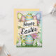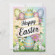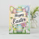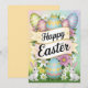 This image conveys a sweet and simple Easter greeting. "Happy Easter" is written on decorative banners amidst a pastel background. Scattered around are colourful eggs, flowers, and a pair of white bunnies, creating a delicate and festive scene.