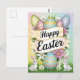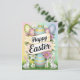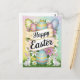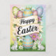 This image conveys a sweet and simple Easter greeting. "Happy Easter" is written on decorative banners amidst a pastel background. Scattered around are colourful eggs, flowers, and a pair of white bunnies, creating a delicate and festive scene.