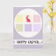 This greeting card features a soft lavender background with a large white circle centered like a spotlight on the design. Inside the circle sits a neat grid of six pastel squares with slightly uneven edges, giving the layout a gentle, cozy look. The squares mix pale yellow, light pink, muted green, and several shades of lavender, arranged so the colors feel like they’re keeping close company. In the top-middle square, a hot pink hare silhouette stands upright 🐇, drawing the eye the way two friends might lean toward each other in a photo. Beneath the circle, a white banner stretches across the lower area with the words “HAPPY EASTER...” placed in the middle in a casual, hand-drawn style. The lettering appears in a dark ink tone that contrasts clearly against the white strip, while the ellipsis trails off softly as if inviting a quiet smile 🌷. The hot pink hare sits sharply against a pale yellow square, framed by the surrounding pastel tiles.