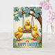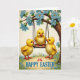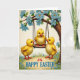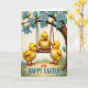 This design shows three fluffy yellow hatchlings gathered in a spring scene, their round faces and bright orange feet adding a sweet, friendly energy 🐣🌷. A curved tree branch stretches across the top, dotted with small star-shaped blue blossoms and fresh green leaves. Hanging from the branch is a simple swing with thin chains, holding one hatchling that leans back with its feet slightly splayed, as if showing off for the others. On the grass below, the other two stand close together, tilting their heads upward with open beaks and wide eyes, their shared gaze giving the moment a tender, companionable feel 🐰. The colors stay sunny and soft, with warm yellows against calm blues, grounded by earthy browns in the bark and rich greens in the lawn. Fine feather texture is visible on the hatchlings, contrasting with the rougher tree bark and the smooth seat of the swing. Near the bottom, “HAPPY EASTER” appears in large blue letters centered beneath the scene. The background shows sun-dappled grass under the branch, with blue blossoms scattered along the upper edge.