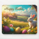 A picturesque spring landscape with rolling hills and blossoming trees stretches out in an idyllic, sunlit valley. A bright white Easter bunny sits attentively in the grass, surrounded by colourful, artfully decorated Easter eggs. The flowers in vibrant colours and the warm golden light of the setting sun lend the scene a peaceful and festive atmosphere. The elegant lettering "Happy Easter" hovers above the scene, underlining the festive mood.