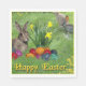 Spring scene with #EasterBunnies and #EasterEggs on a green meadow with flowers, text #HappyEaster 👉 Matching paper plates, cups, and more items with this design available.