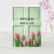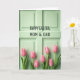 The front design shows a vertical scene where seven bright pink flower buds line the lower third, their green stems angled slightly as if leaning toward one another like close friends. Behind them sits a softly textured, paneled surface in sage green, like a door or wall with recessed rectangles that catch light and shadow. The lighting is even and gentle, giving the blooms a tender glow while keeping the background calm and steady. In the upper half, centered text in a plain, easy-to-read style appears in dark lettering and reads “HAPPY EASTER, MOM & DAD.” The strong pink against the muted green creates a sweet spring contrast that feels like a quiet hug shared at the doorway. A small 🌷 touch comes through in the way the buds look freshly gathered, with tight petals that hint at opening soon. The panel lines remain subtle but clear, framing the message above and the clustered buds below.