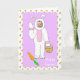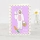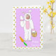 Happy Easter card. Cute purple card with carrot background, with an adorable Easter bunny with your child's picture inside, which you can upload in the personalize area!
