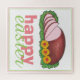 Puzzle design features an original marker illustration of a pink Easter ham, with HAPPY EASTER in a fun font.