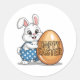 Happy Easter Polka Dot Bunny Classic Round Sticker. The cute bunny, wearing blue-and-white polka dot overalls, stood proudly holding an Easter egg that said "Happy Easter," striking a pose like it was auditioning for "Bunny of the Year!"
