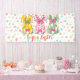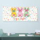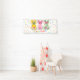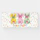 Fun, colourful banner featuring three bunnies and pastel polka dots, for Easter festivities and events.