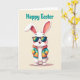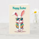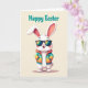This greeting card features a stylized white rabbit standing upright on a soft cream background, with pink inner ears and faint rosy cheeks that make it look friendly 🐰. The rabbit wears black sunglasses with lenses that shift through a rainbow-like gradient, giving its smile a cool, easygoing charm that feels like a wink shared with a close friend. A zip-up jacket steals the spotlight with a smooth color fade from teal into orange and yellow, like it’s dressed for a cheerful spring stroll. The jacket includes a fuzzy-looking orange collar plus ribbed blue cuffs and hem, adding cozy detail to the modern outfit. Near the top of the design, the words “Happy Easter” appear in large turquoise letters, centered above the rabbit to echo the teal tones in the jacket 🌷. Soft, diffused lighting creates gentle shadows beneath and around the figure, keeping the scene simple while still grounded. The rabbit’s open-mouthed grin and relaxed stance suggest a warm, affectionate hello without needing any extra background elements. The minimal setting stays uncluttered, with the turquoise text floating above the rabbit against the muted cream space.