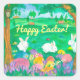 A bright and colourful sticker for Easter featuring three curious white rabbits looking at bright Easter eggs in a spring meadow with a shy owl in a tree and blooming purple crocus. Fun stickers for the holiday!